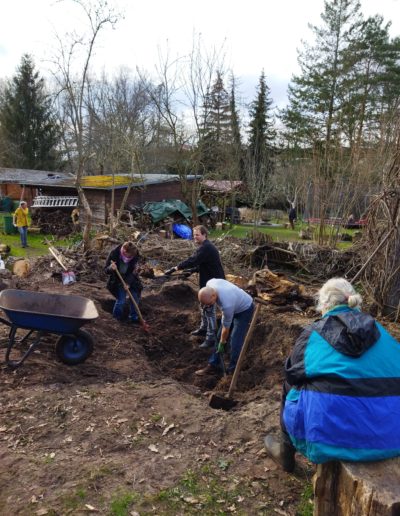Jedes Jahr machen wir mehrere Arbeitseinsätze, wo alle Gartenmitglieder gemeinsam anpacken und je nach Jahreszeit zum Beispiel aufräumen, bauen, pflanzen, Laub und Holz wegräumen.